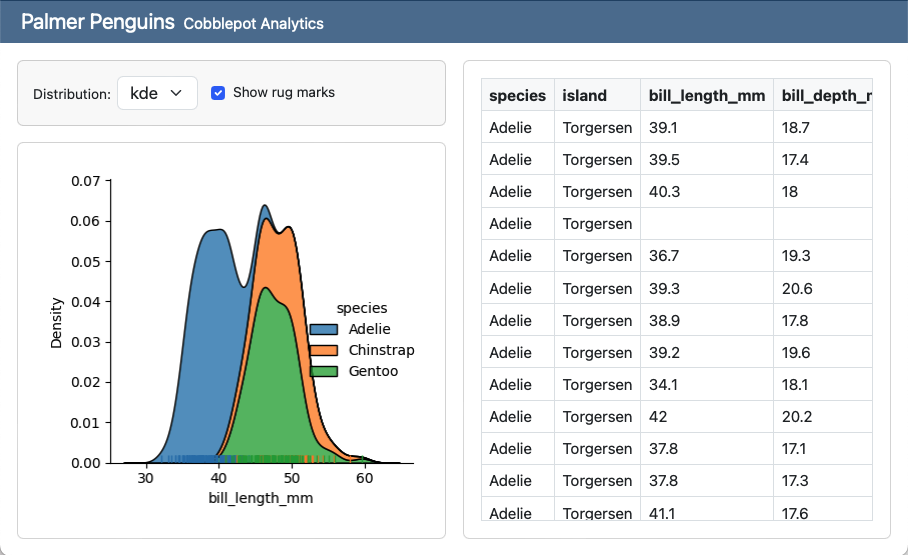 A screenshot of a Penguin Bills card. The card sidebar on the left contains two dropdown menus, one for Variable and one for Distribution and a checkbox to show rugmarks. To the right, a plot shows a histogram of bill_length_mm colored by species.